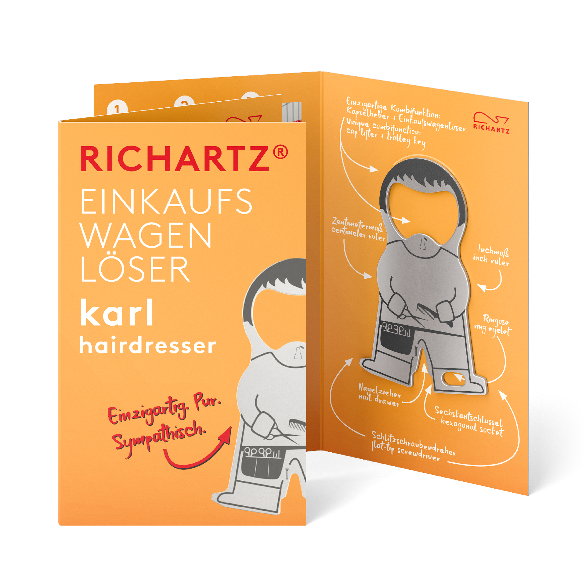 We are family, sagt Karl! In seiner EINKAUFSWAGENLÖSER-karl-Familie ist für jede Branche und für jeden Anlass dabei - auch für kleinste Zielgruppen. Unser EINKAUFSWAGENLÖSER karl selbst kommt ultraflach, handlich und mit acht Funktionen ausgestattet an jedem Schlüsselbund klar. RICHARTZ-typisch treffen hier Formschönheit auf Qualität, Funktion auf Sympathie.