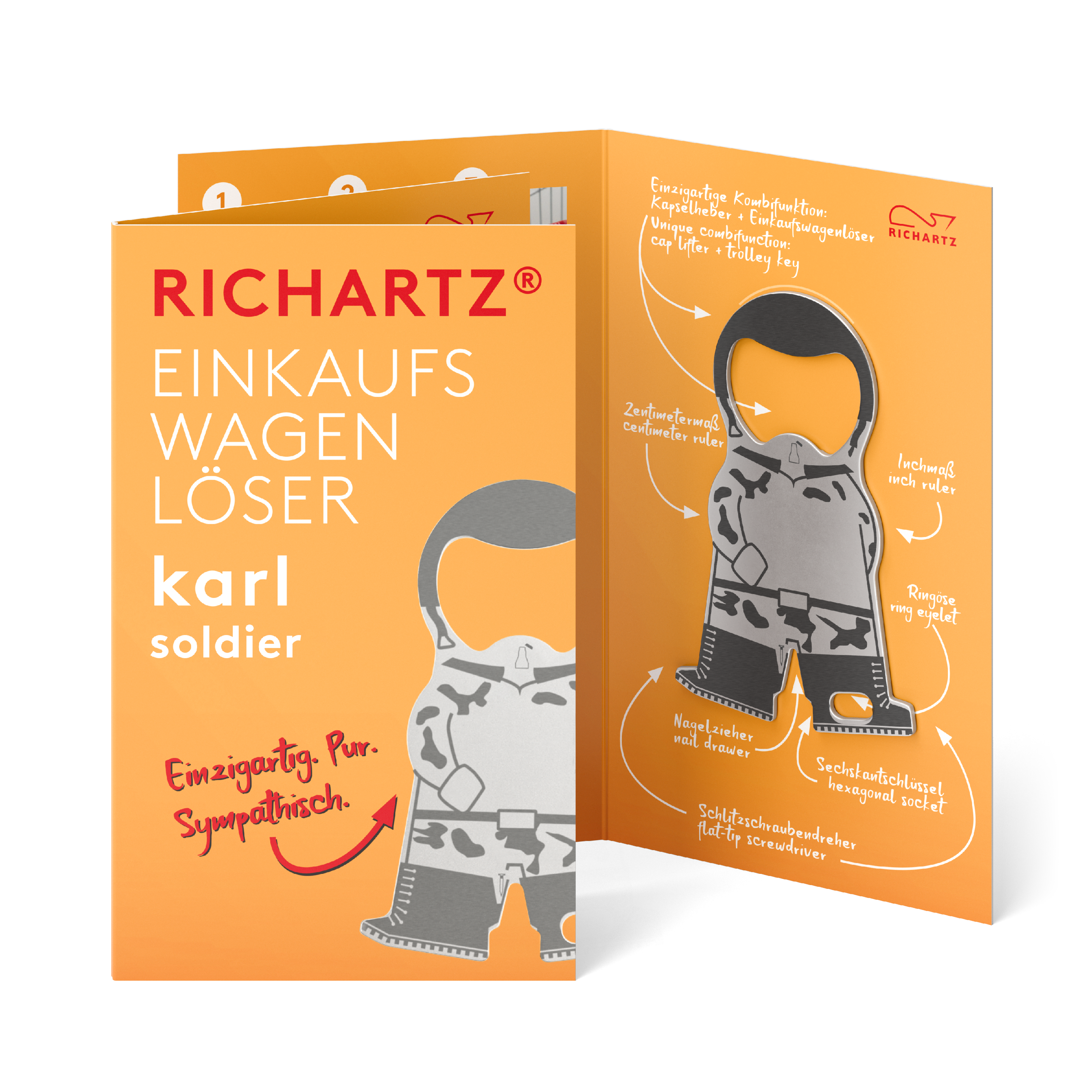 We are family, sagt Karl! In seiner EINKAUFSWAGENLÖSER-karl-Familie ist für jede Branche und für jeden Anlass dabei - auch für kleinste Zielgruppen. Unser EINKAUFSWAGENLÖSER karl selbst kommt ultraflach, handlich und mit acht Funktionen ausgestattet an jedem Schlüsselbund klar. RICHARTZ-typisch treffen hier Formschönheit auf Qualität, Funktion auf Sympathie.