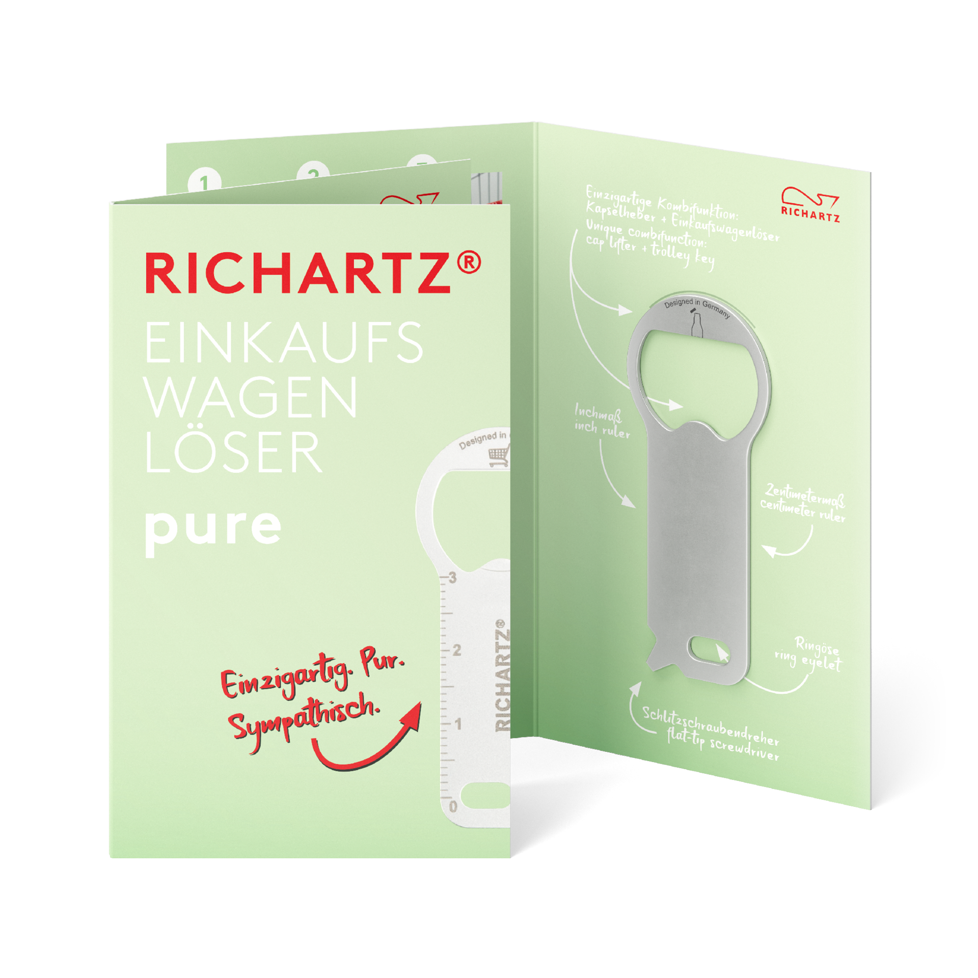 Einkaufswagen und Flaschen haben ab sofort eines gemeinsam: Für beide ist jetzt in Deinem Alltag ein Spezialist zuständig. Wenn Du es ihm erlaubst! Denn unser EINKAUFSWAGENLÖSER pure kombiniert Flaschenöffner und Einkaufswagenlöser-Funktion auf kleinstem Raum. Mit seinen insgesamt sechs Funktionen, der RICHARTZ-typisch hohen Qualität und seiner puristischen Form überzeugt er dazu noch in vielen anderen Alltagssituationen.