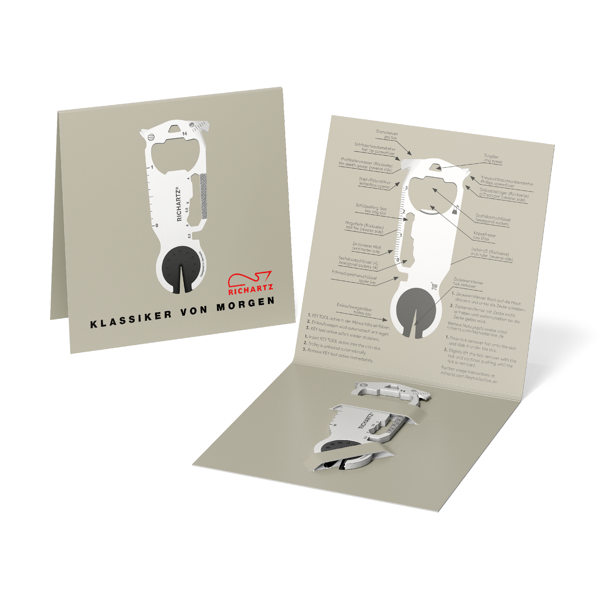 Das Tool für alle Fälle! Und für besonders Aktive: Es repariert, bewältigt Zecken in Nachbarshunden, dreht Schrauben und kürzt Nägel. Es hilft bei Fahrradpannen und in vielen Lebenslagen, in denen man einfach schnell smarte Hilfe braucht. Dabei sieht das Tool auch noch gut aus: Designfans freuen sich, dass das schöne Stück nebst hoher Qualität designed in Solingen einen Designpreis mit sich bringt.