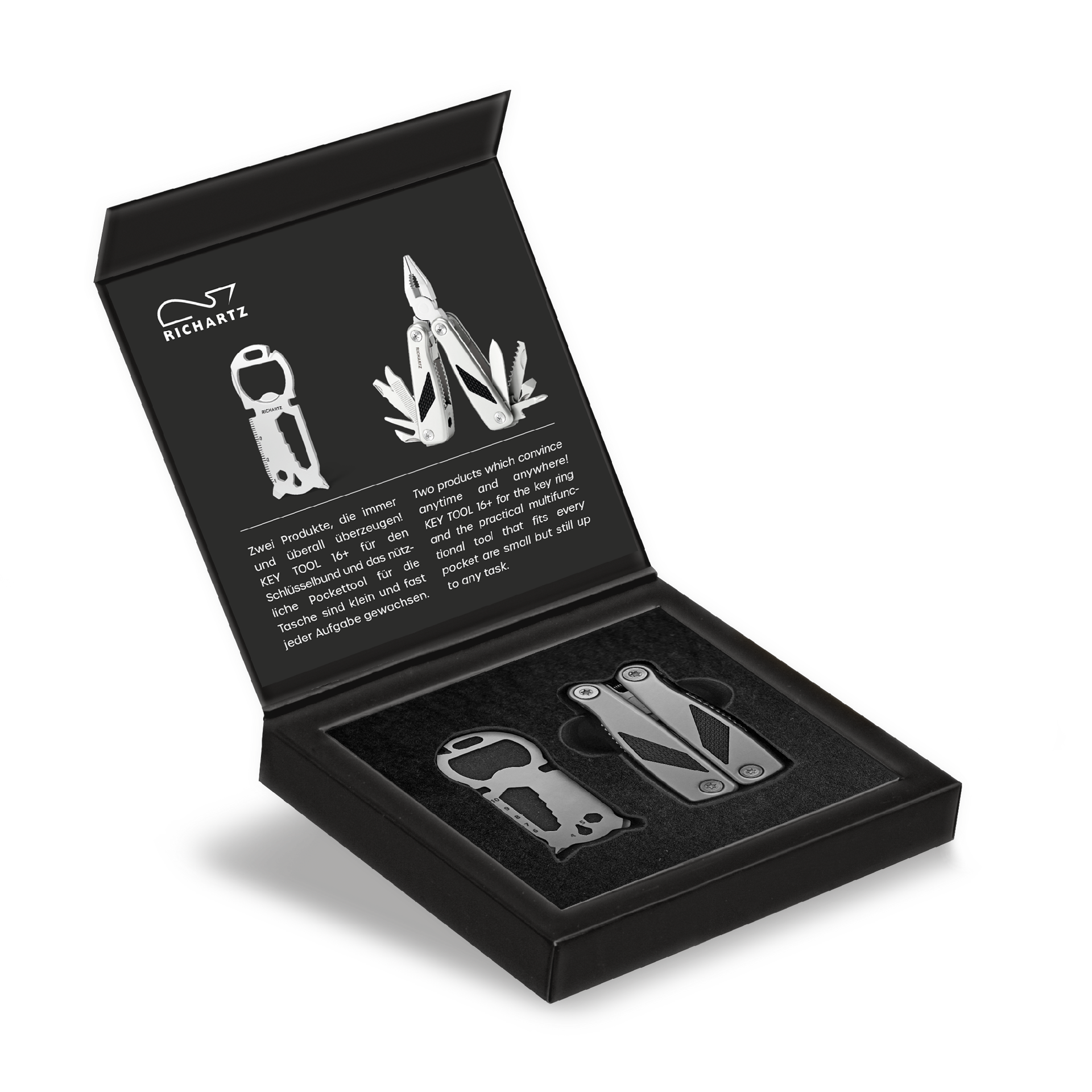 Zwei Produkte, die immer und überall überzeugen. GRIP tool pocket, das nützliche Pocket tool für die Tasche, und KEY tool 16+, das schlüsselgroße Tool mit 16 Funktionen für den Schlüsselbund, sind so klein und doch jeder Aufgabe gewachsen. Die gute Verarbeitung aus matt gestrahltem Edelstahl besticht. Ein Set, der jeden Tag Freude macht.
