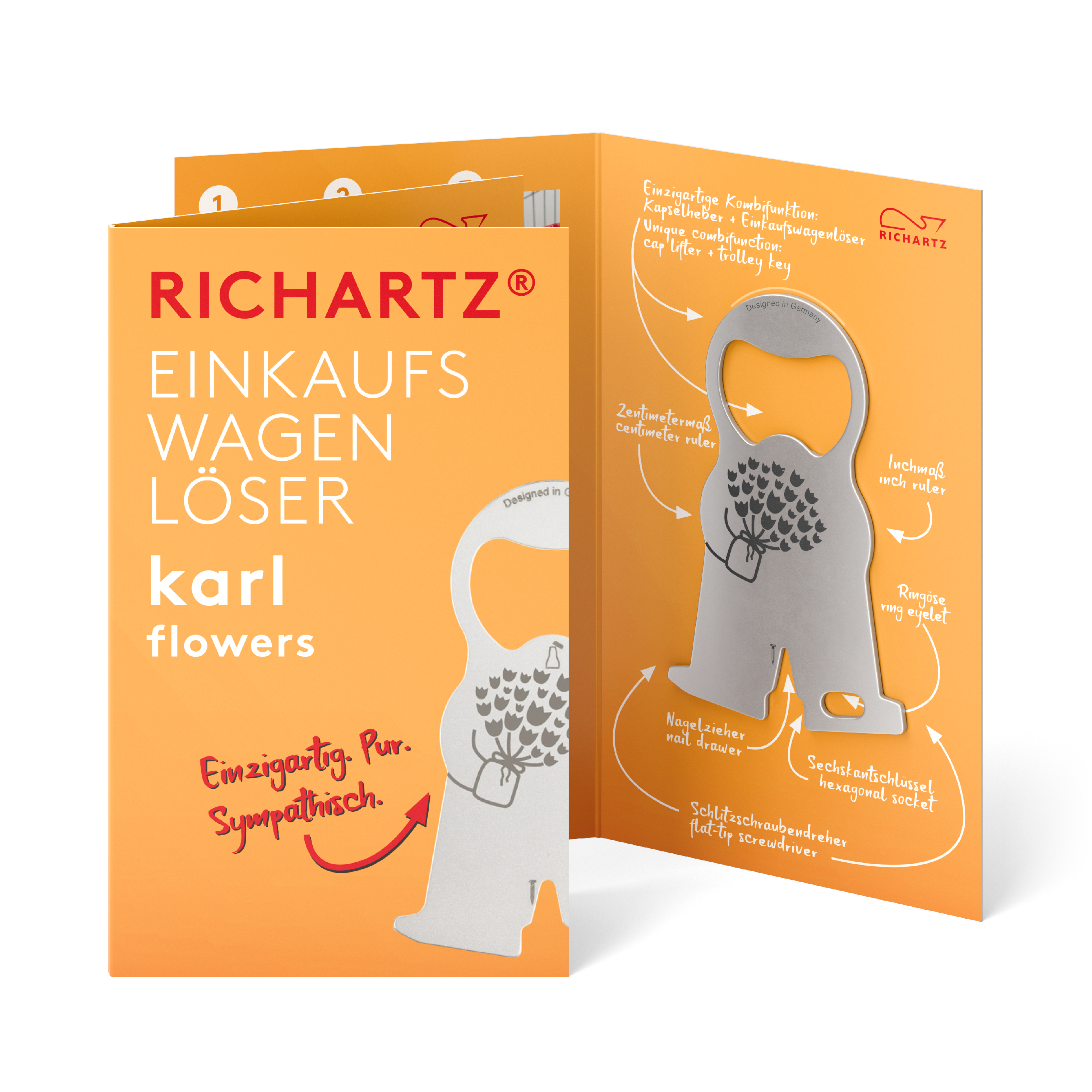 We are family, sagt Karl! In seiner EINKAUFSWAGENLÖSER-karl-Familie ist für jede Branche und für jeden Anlass dabei - auch für kleinste Zielgruppen. Unser EINKAUFSWAGENLÖSER karl selbst kommt ultraflach, handlich und mit acht Funktionen ausgestattet an jedem Schlüsselbund klar. RICHARTZ-typisch treffen hier Formschönheit auf Qualität, Funktion auf Sympathie.