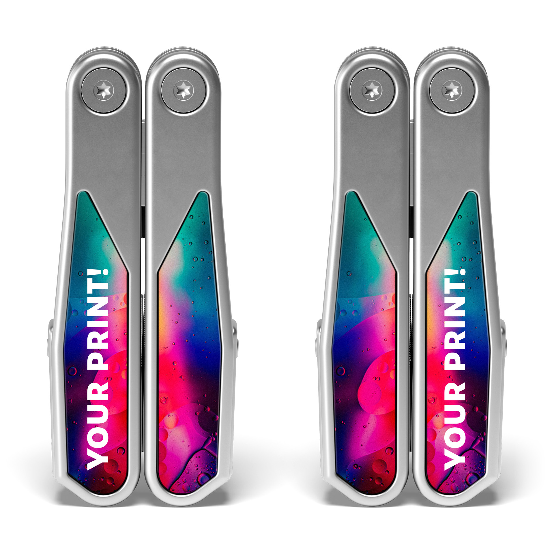 Bei diesem Multitool können Werbende noch einen drauf setzen: Sicher verriegelbare Funktionen, hohe Präzision und ausgezeichnetes Design machen das gute Stück zu einem sicheren und ästhetischen Alltagsbegleiter. Für Werbende bietet es zudem 4c-bedruckbare Griffschalen-Inlays, die man in brillanten Farben und mit hohem Detailgrad veredeln kann. Bitset und Tasche sind immer dabei!