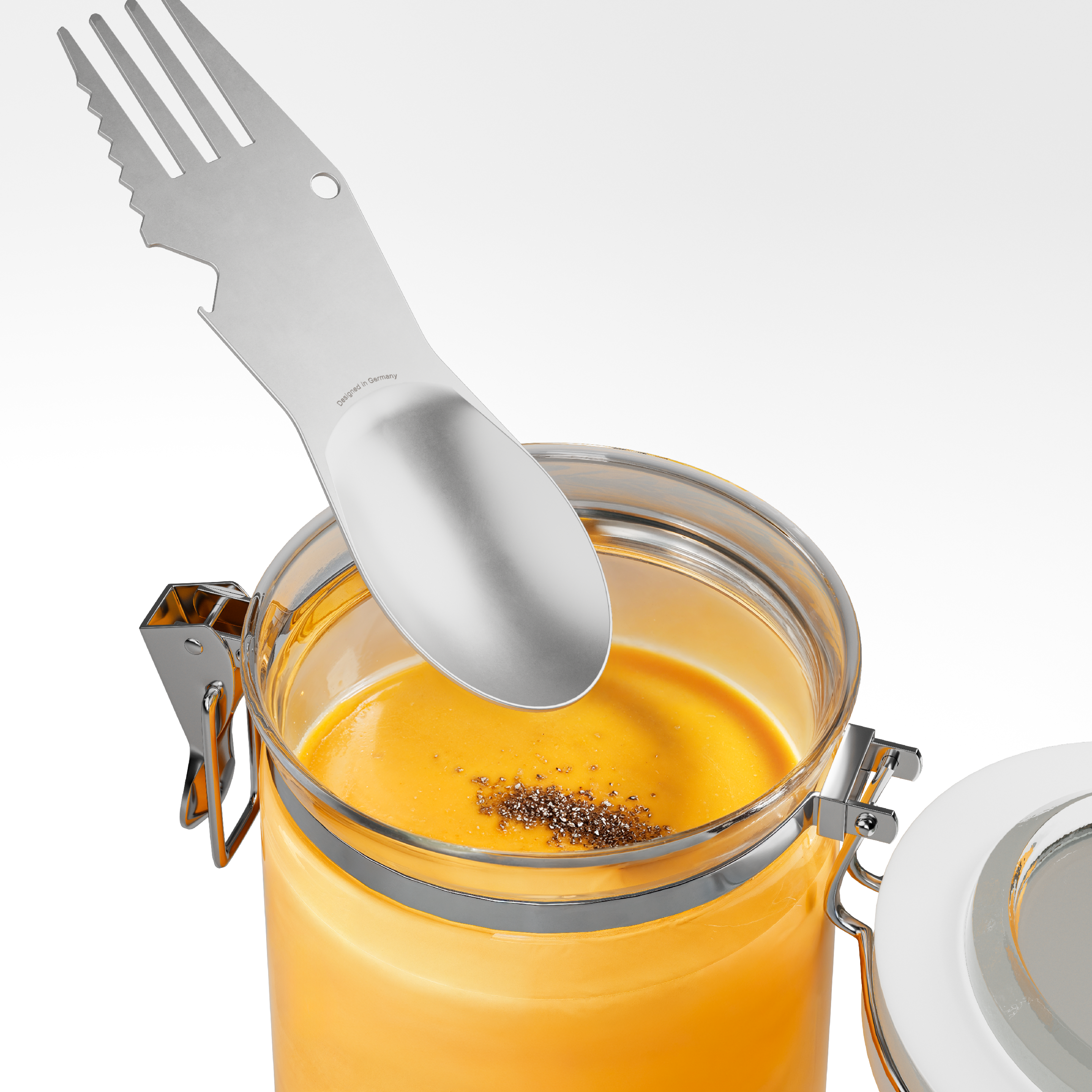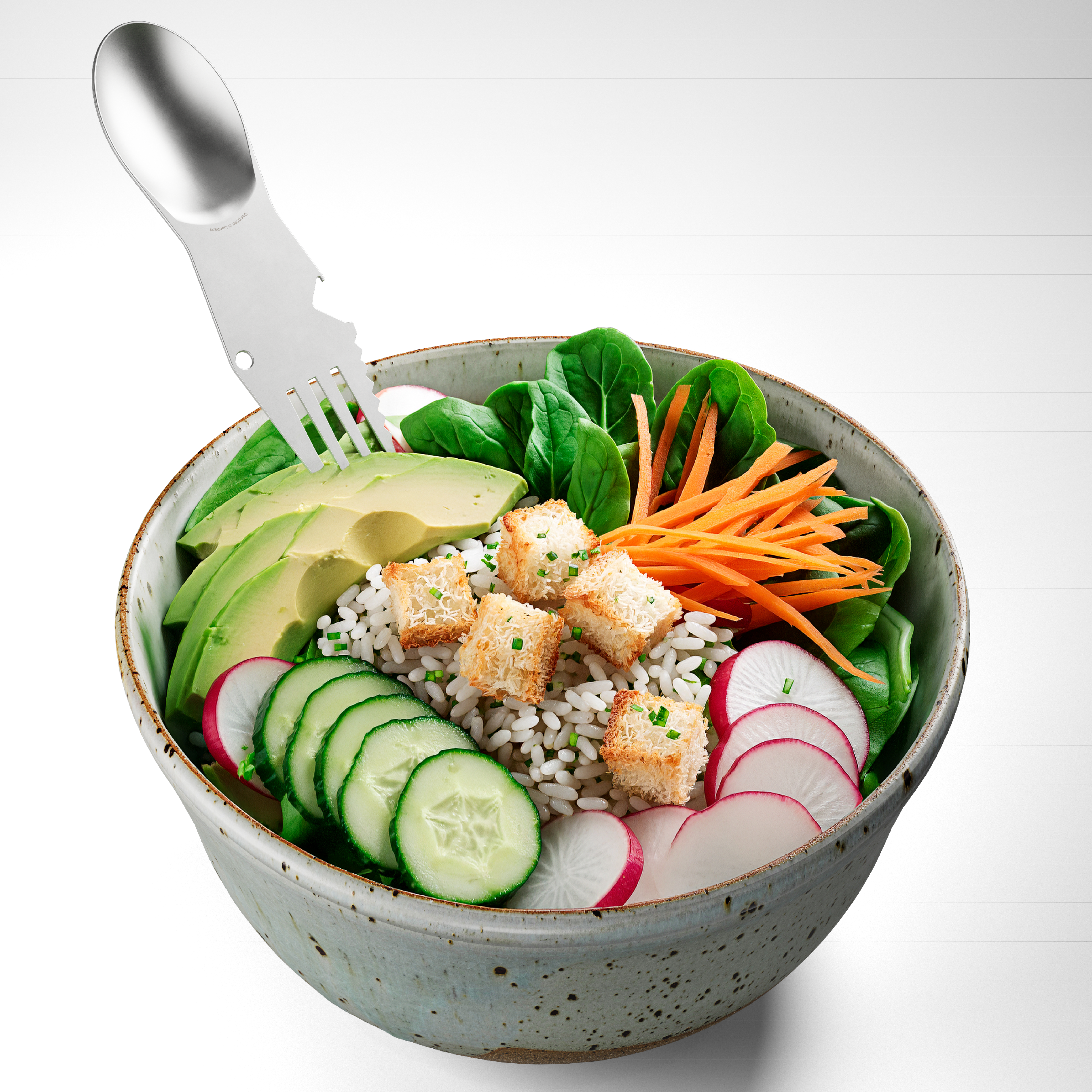 Wenn Gabel, Löffel, Messer und Öffner an einem kompakten Tool zusammenkommen, sieht dasklar nach einem guten, kompletten Diner aus. Mitdem vollwertigen Löffel und der Gabel mit gezahnter Schneide ist jedes Gericht schnell verputzt und auchder Drink dazu wird im Handumdrehen geöffnet.Ab jetzt kann das Einwegbesteck einpacken, dennSNACKTOOL wird Dich für eine lange Zeit begleiten!