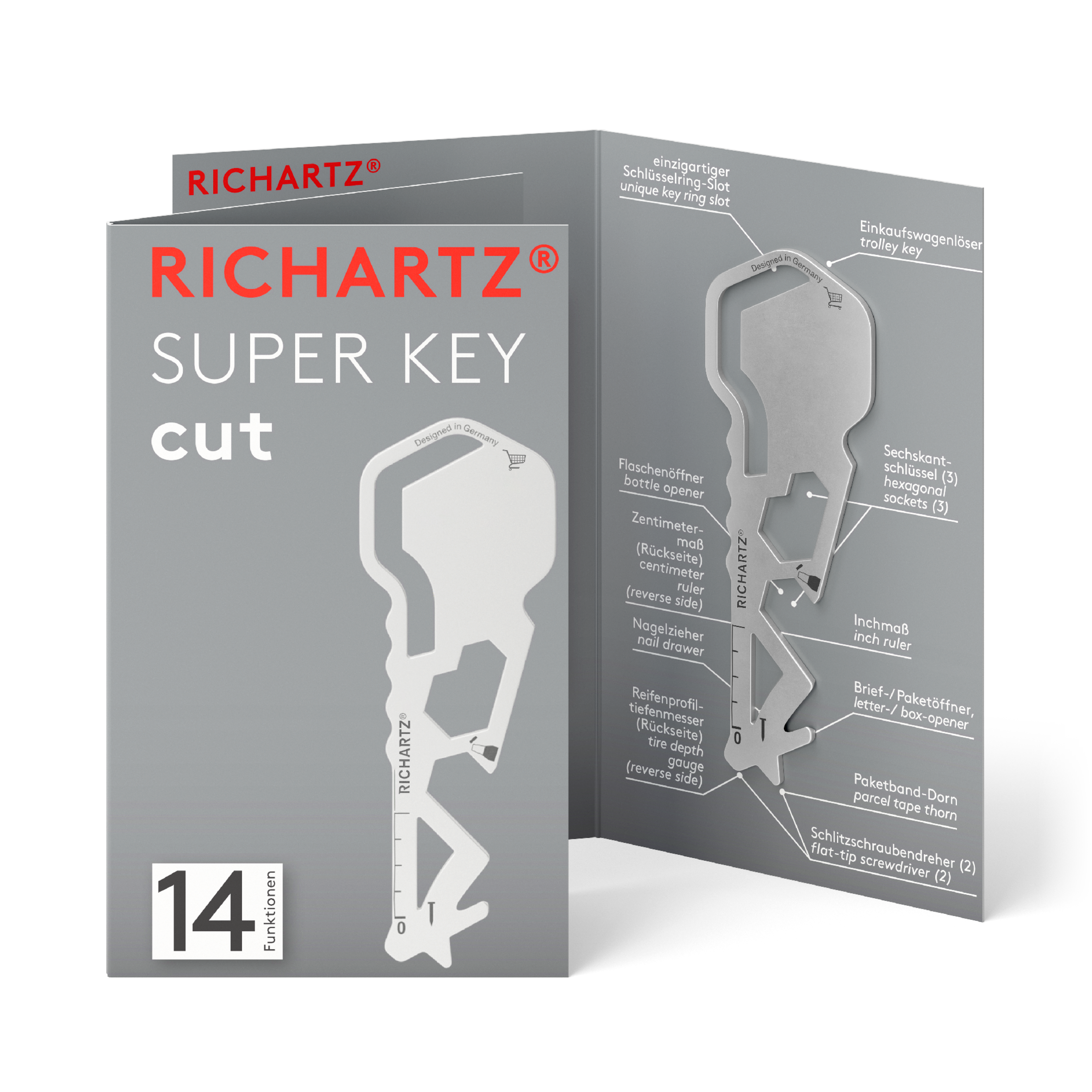 Unser Schneidigstes aus der Familie der SUPER KEYs: Die cut-Variante tarnt sich zwar in Schlüsselform, aber wenns drauf ankommt, leistet sie erfolgreiche Dienste auch beim Öffnen von Paketen oder echten Briefen. Ganz zu schweigen vom Einkaufswagenlösen, Flaschenöffnen, Schraubendrehen und Co.