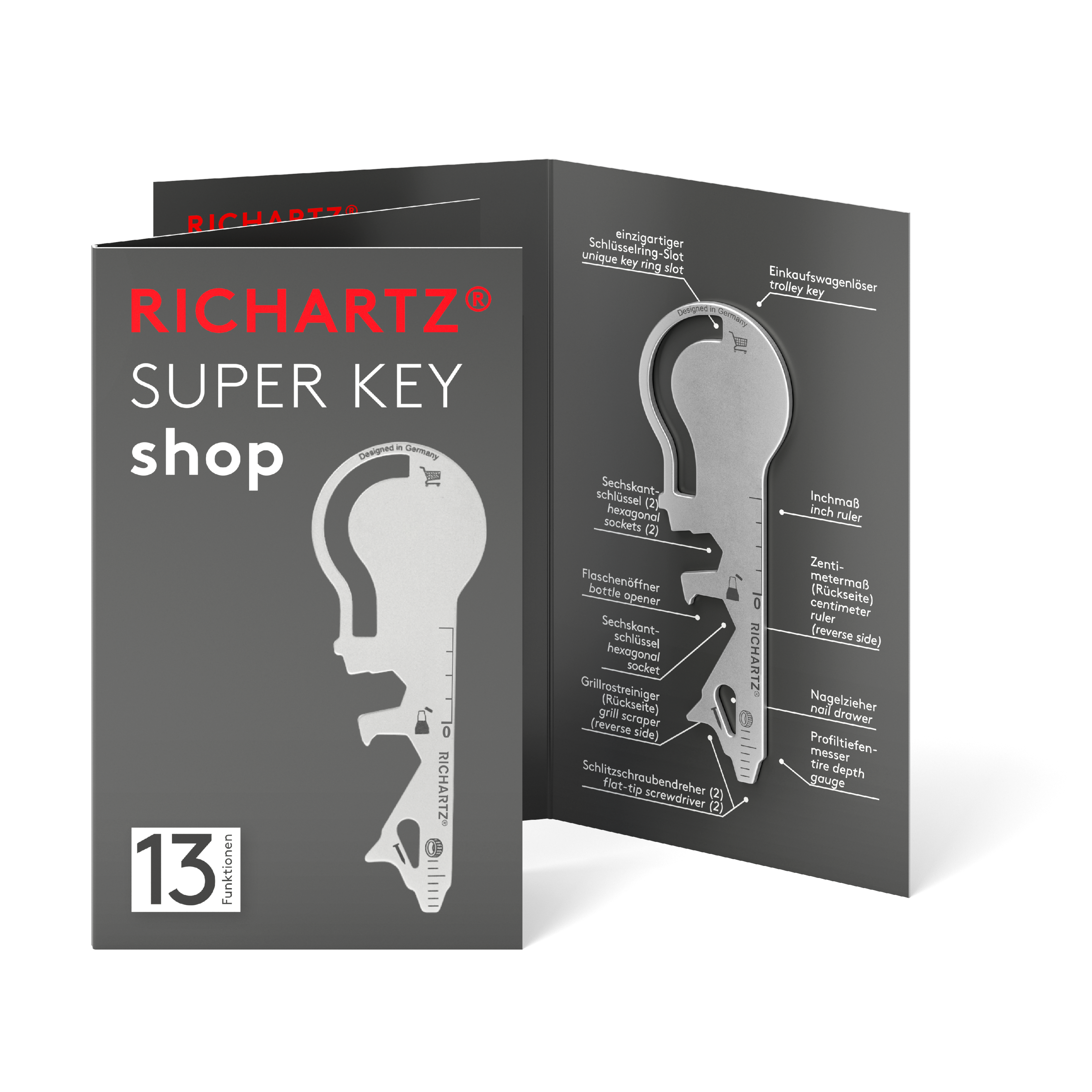 Dein Schlüssel zum entspannteren, leichteren Alltag! Und das darfst Du gleich mehrfach wörtlich nehmen: Unser SUPER KEY shop kommt in Schlüsselform daher, ist ultraflach und handlich. Mit seinen leichtgewichtigen 8 Gramm ist er nahezu unbemerkt überall dabei. Positiv bemerkbar macht er sich dann bei vielen Alltagsherausforderungen - mit Einkaufswagenlöser, Flaschenöffner, Schraubendreher und vielem mehr.