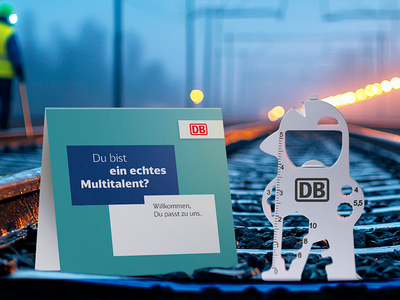 Recruiting ist auch für die Deutsche Bahn wichtig. Um den Erfolg von Recruiting-Maßnahmen zu erhöhen, hat sie sich für ein KEY TOOL bob als Markenbotschafter entschieden. Die sympathische Formgebung kann mit einem Schaffner verbunden werden, die hohe Qualität und Nützlichkeit sind ein echter Mehrwert für den Nutzer. Abschließend verbindet der Werbeclaim perfekt Anlass, Produkt und Marke.