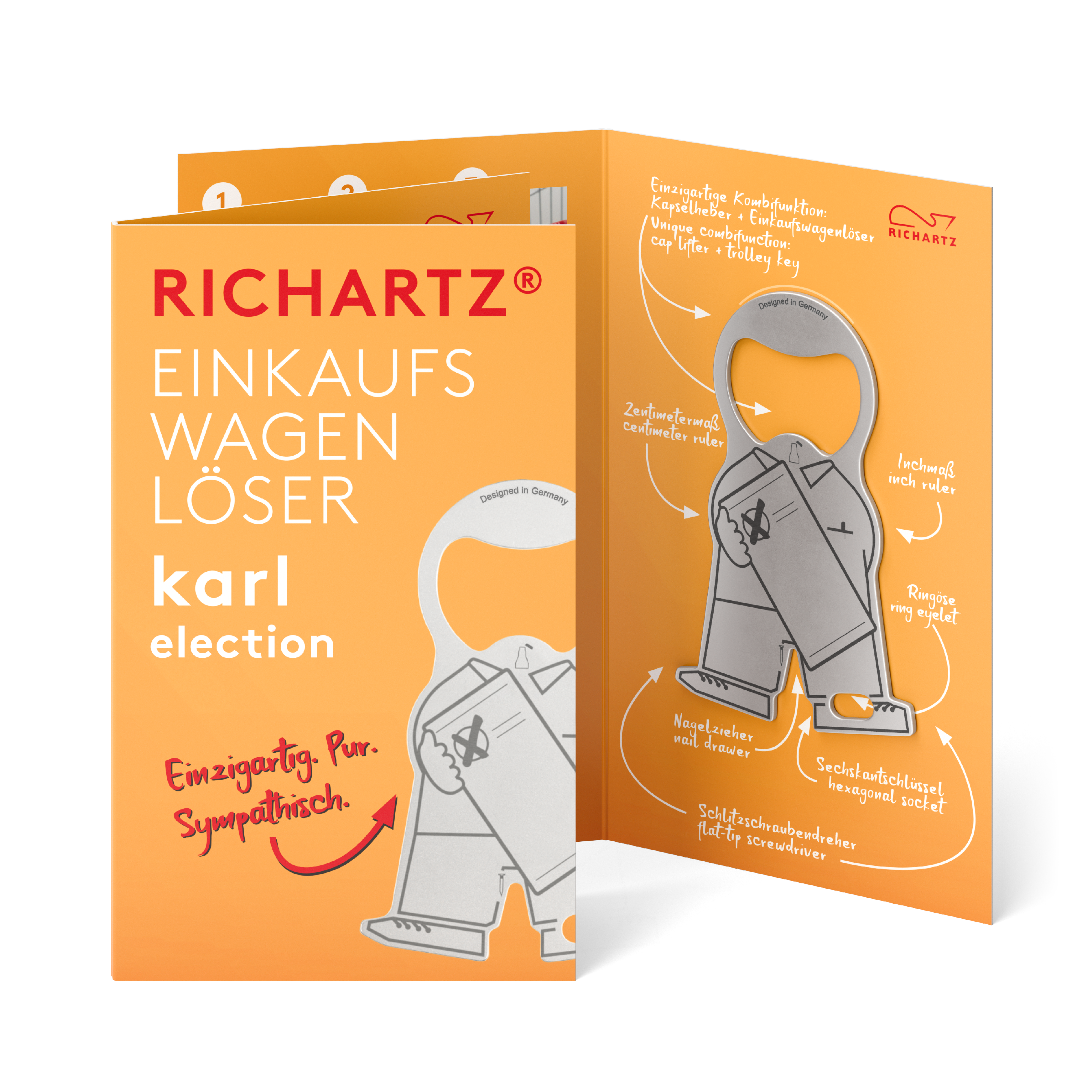 We are family, says Karl! His karl family of shopping trolley keys has something for every sector and every occasion - even for the smallest target groups. Our EINKAUFSWAGENLÖSER karl itself is ultra-flat, handy and equipped with eight functions to fit on any key ring. In typical RICHARTZ fashion, beauty of form meets quality, function meets sympathy.