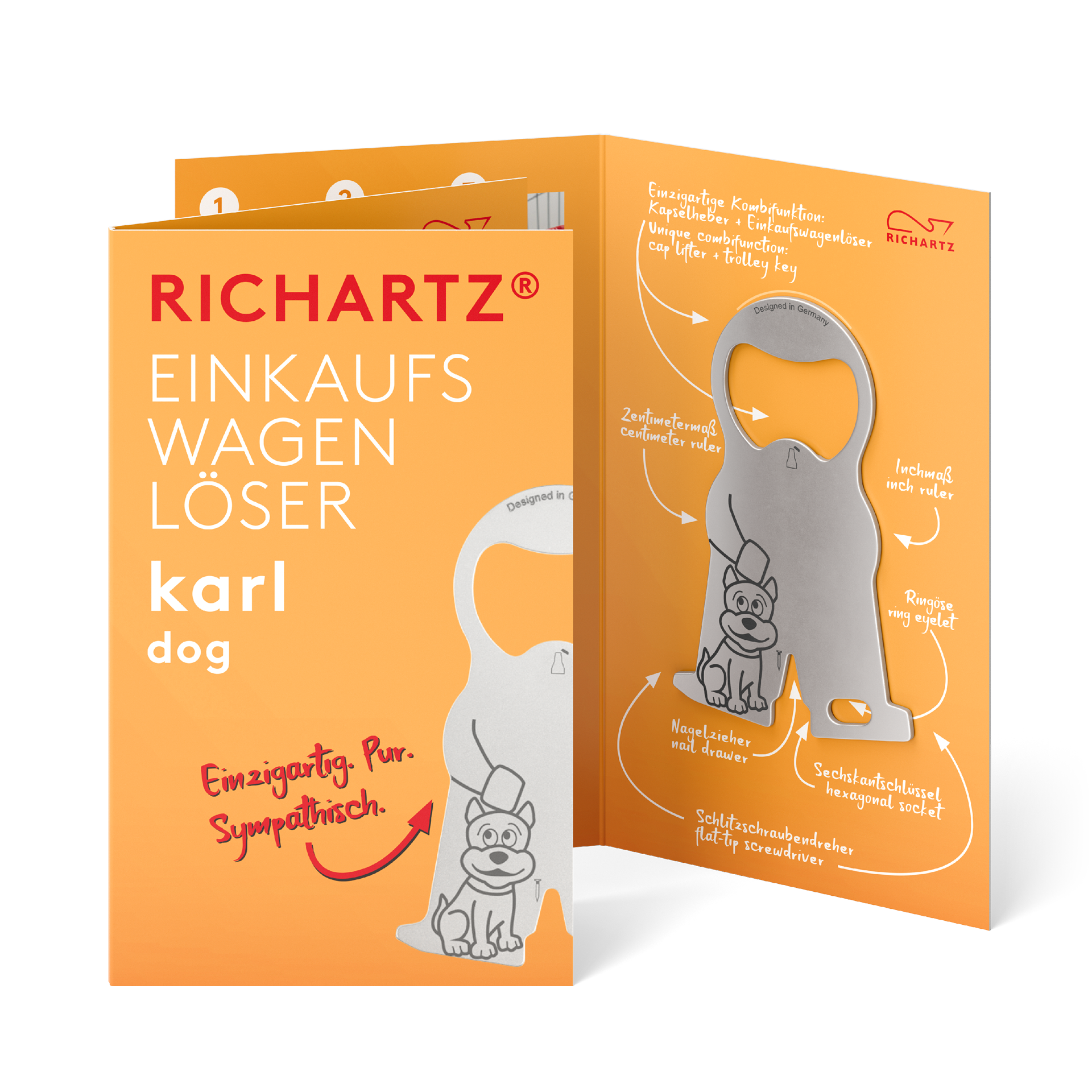 We are family, says Karl! His karl family of shopping trolley keys has something for every sector and every occasion - even for the smallest target groups. Our EINKAUFSWAGENLÖSER karl itself is ultra-flat, handy and equipped with eight functions to fit on any key ring. In typical RICHARTZ fashion, beauty of form meets quality, function meets sympathy.