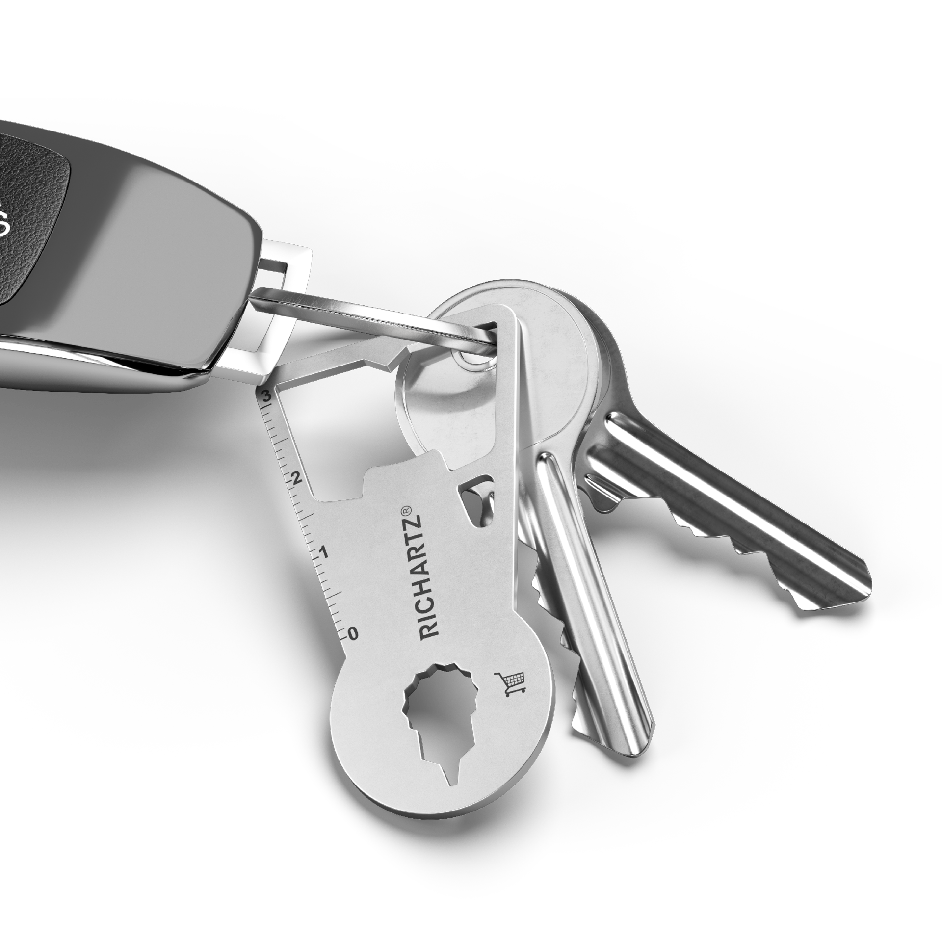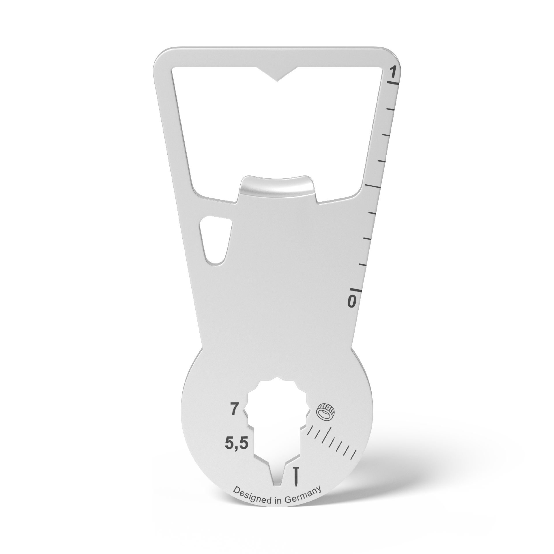 Ultra-flat, handy and easy to carry on any key ring: no bottle cap is safe from our FLASCHENÖFFNER plus. And it can do so much more: it opens shopping carts and other everyday challenges such as taking measurements, pulling nails and much more!