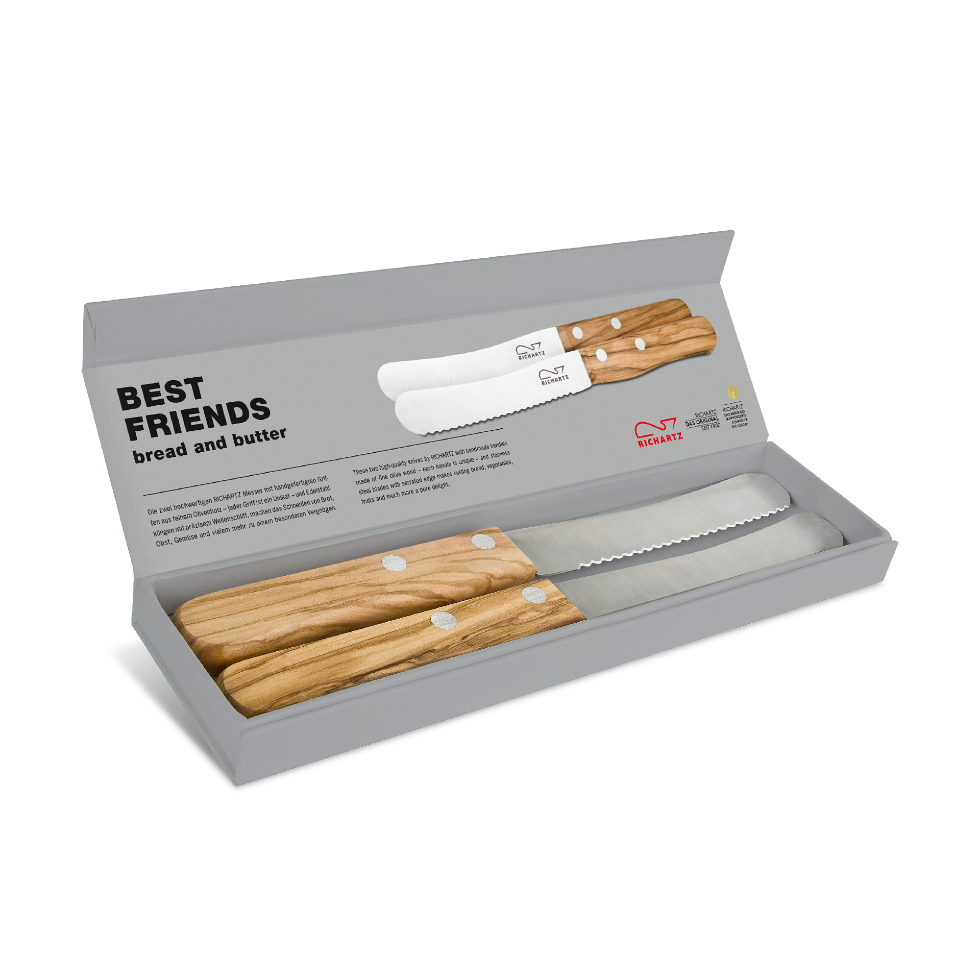 These two high-quality knives by RICHARTZ with handmade handles made of fine olive wood – each handle is unique – and stainless steel blades with serrated edge makes cutting bread, vegetables, fruits and much more a pure delight. A set which gives pleasure every day.