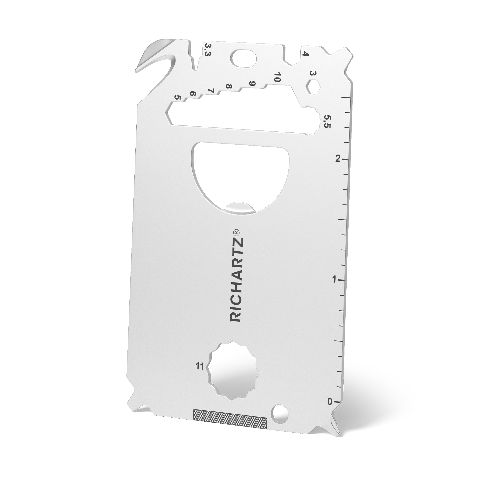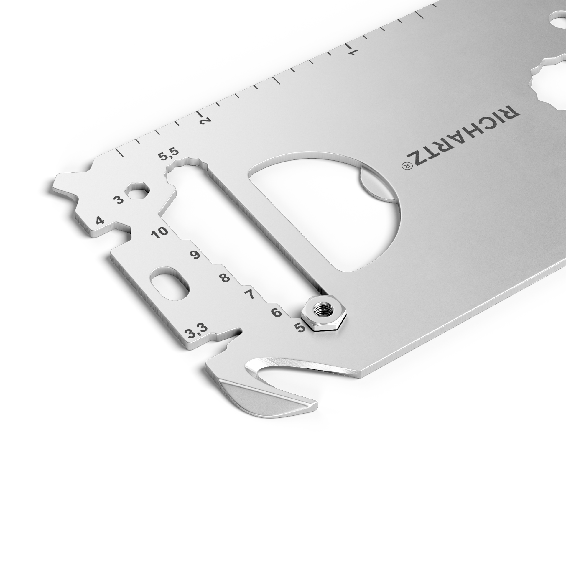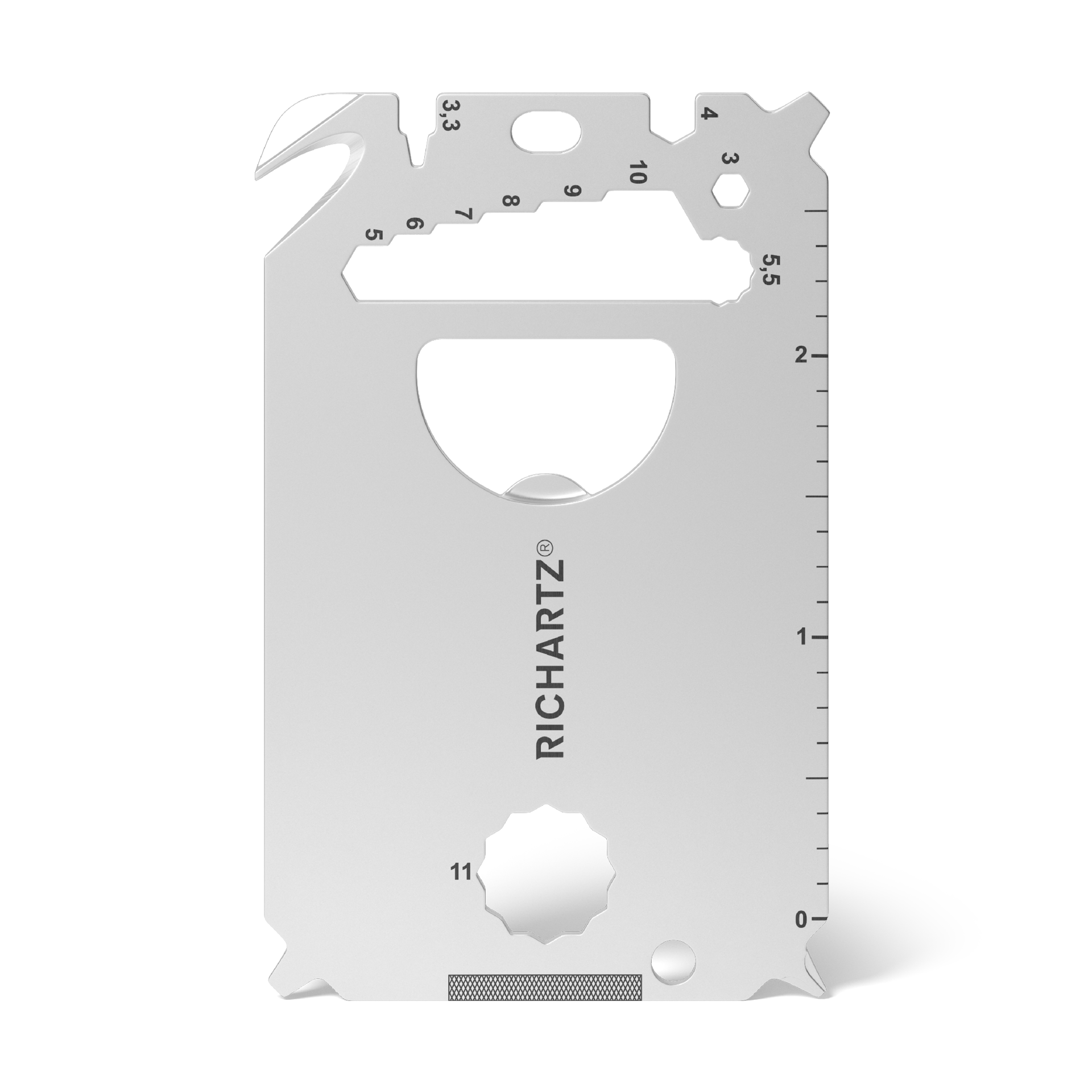 Extremely flat, precise and functional. The credit card sized RICHARTZ pocket card made of high quality matt finished stainless steel will be an indispensable companion. 23 functions on the smallest space satisfy nearly every need: cap lifter, 3 flat-tip screwdriver, Phillips screwdriver, letter/box opener, 7 hexagonal sockets, 2 multi-thooth keys, 2 spoke keys, nail drawer, nail file, 2 rulers (inch and centimeter), 2 eyelets. Clear design and highest functionality you never want to miss again.