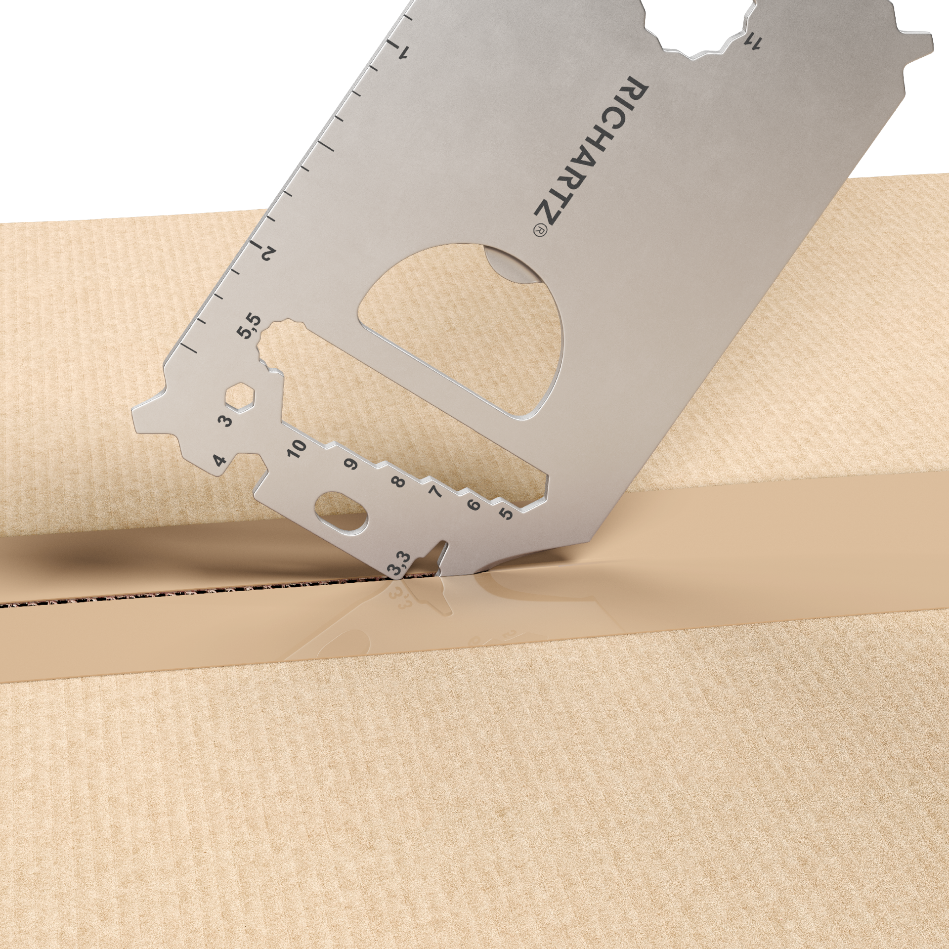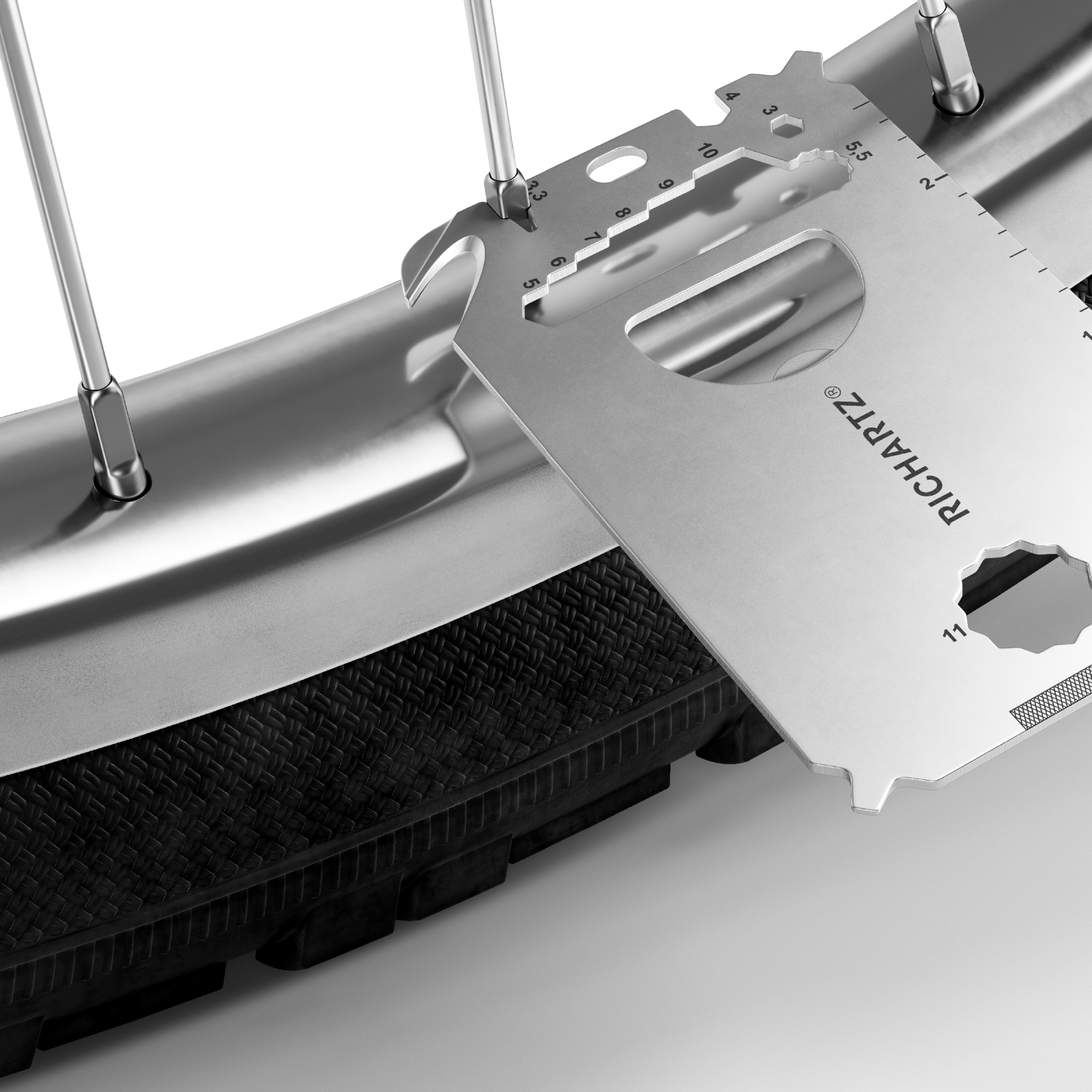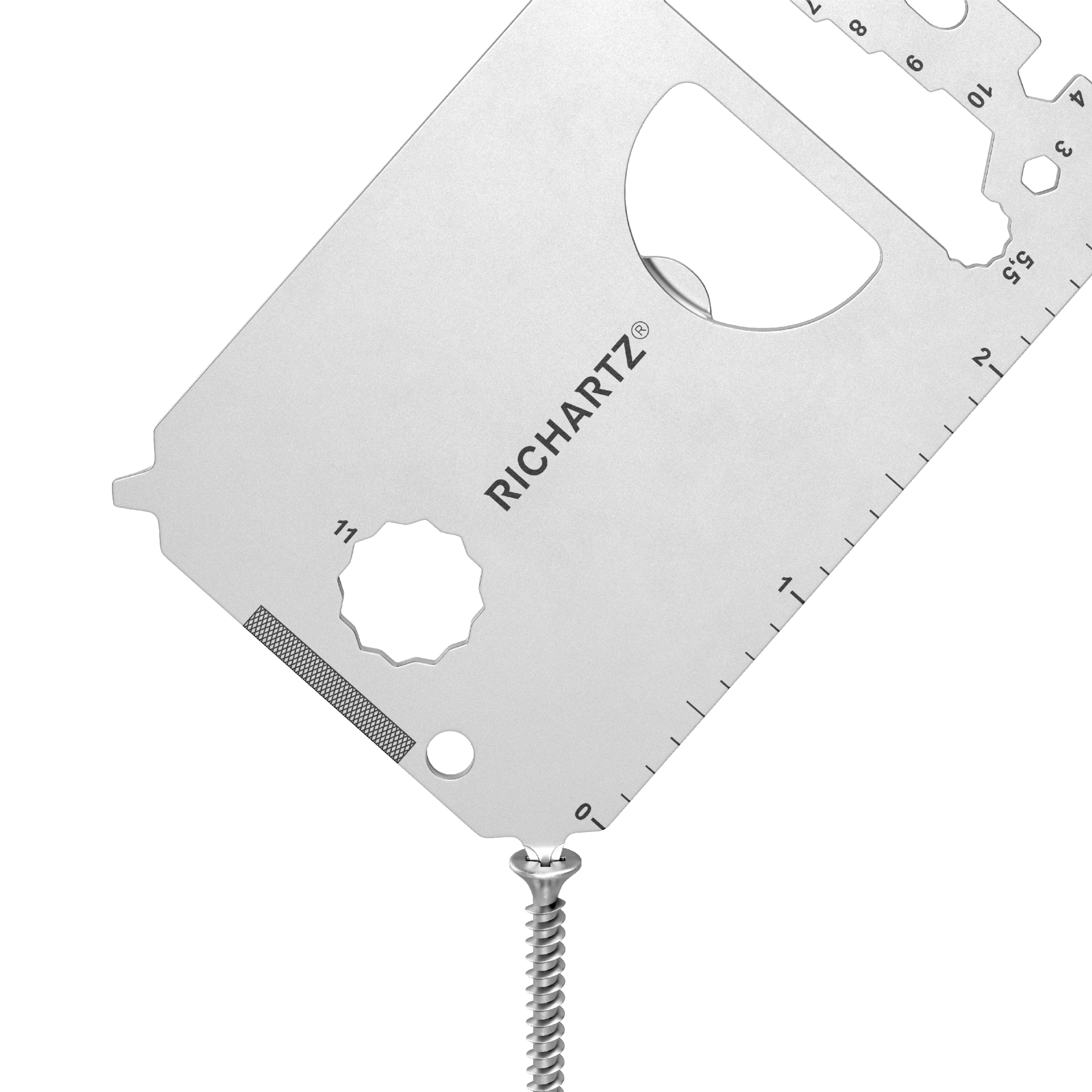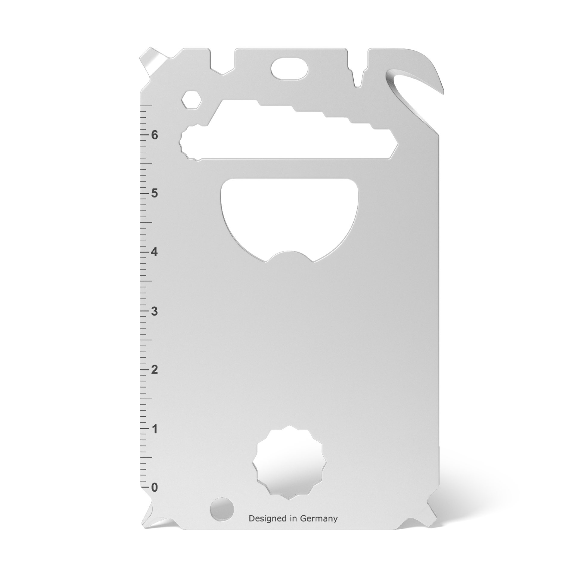 Extremely flat, precise and functional. The credit card sized RICHARTZ pocket card made of high quality matt finished stainless steel will be an indispensable companion. 23 functions on the smallest space satisfy nearly every need: cap lifter, 3 flat-tip screwdriver, Phillips screwdriver, letter/box opener, 7 hexagonal sockets, 2 multi-thooth keys, 2 spoke keys, nail drawer, nail file, 2 rulers (inch and centimeter), 2 eyelets. Clear design and highest functionality you never want to miss again.