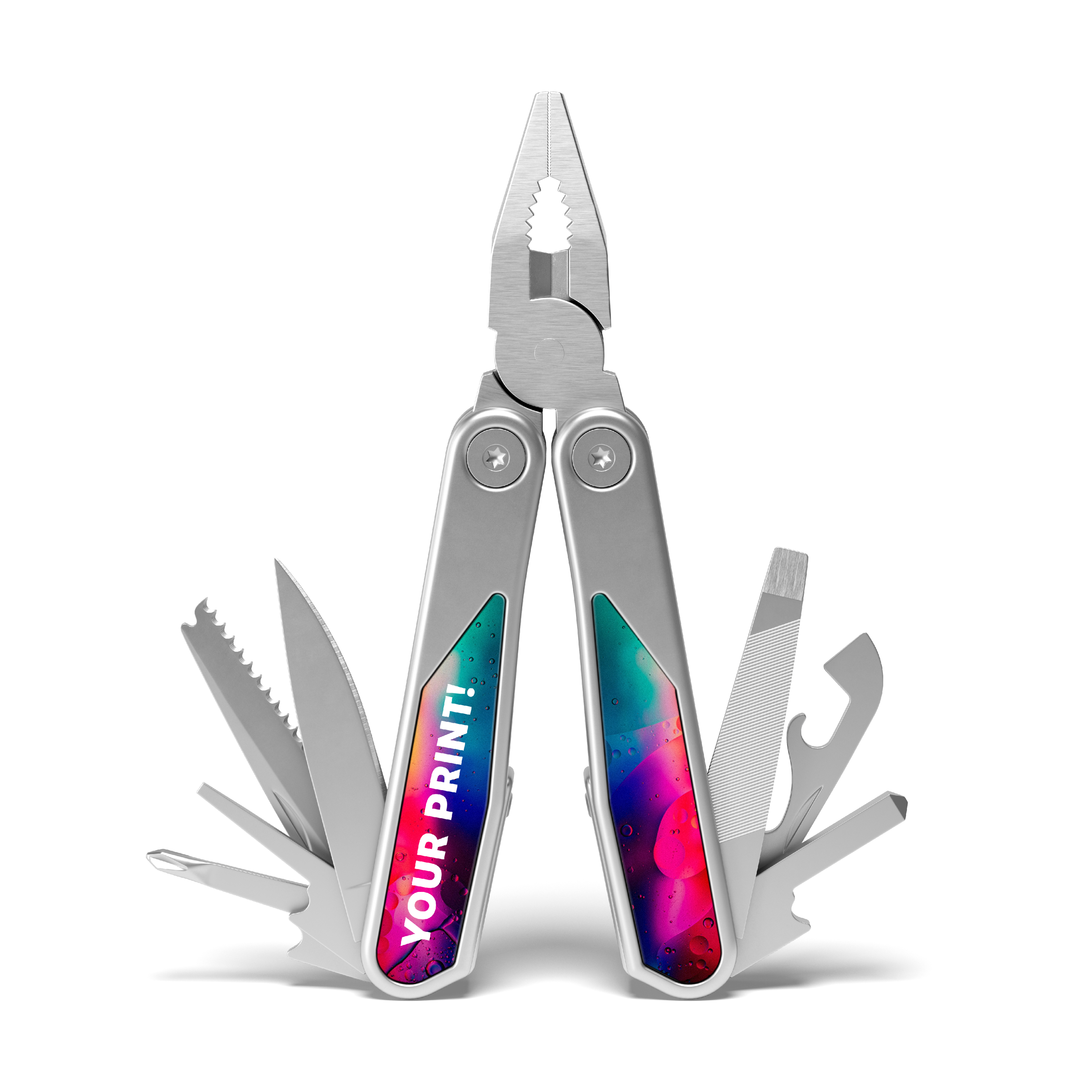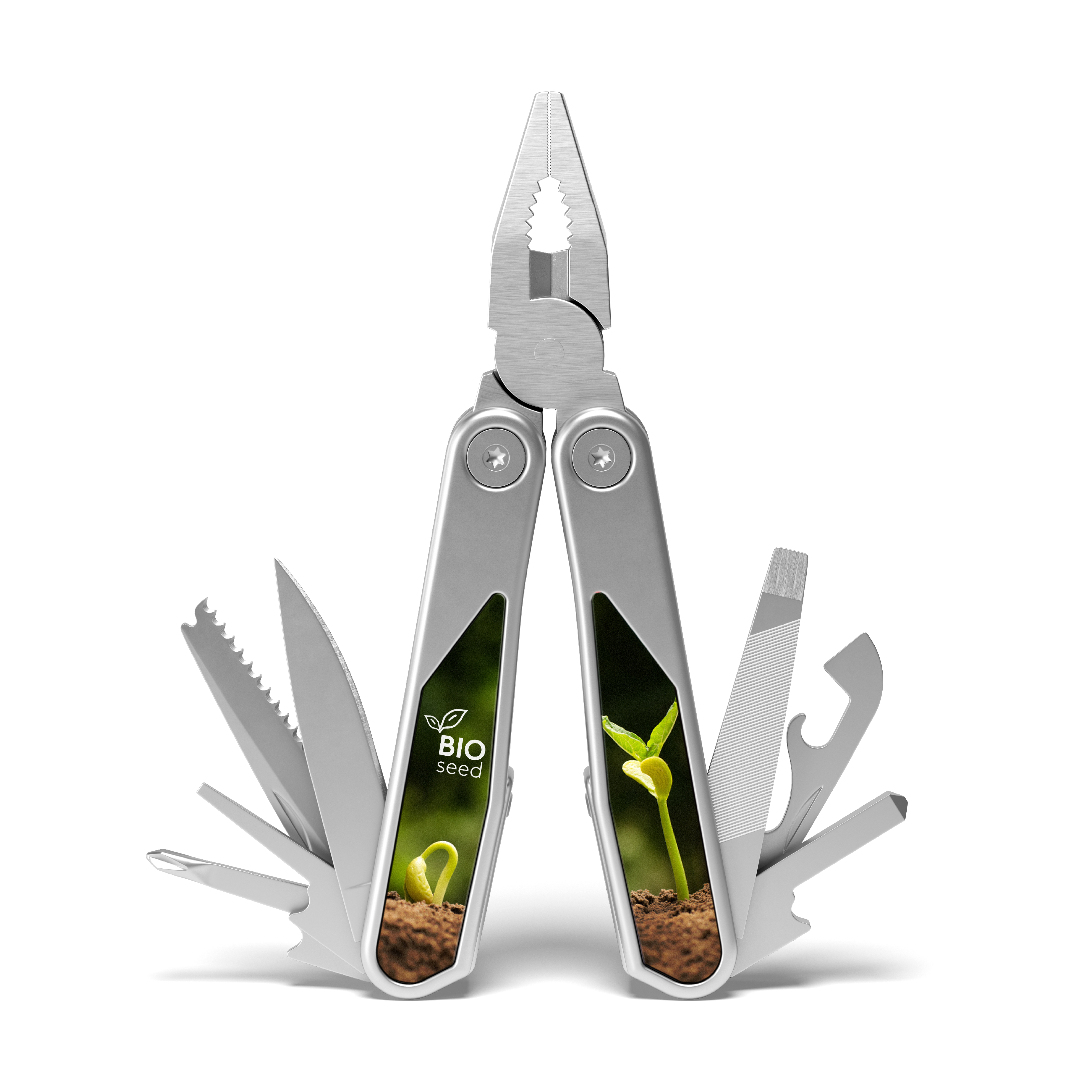Advertisers can go one better with this multitool: Securely lockable functions, high precision and excellent design make it a safe and aesthetic everyday companion. For advertisers, it also offers 4c printable handle inlays that can be finished in brilliant colors and with a high level of detail. Bit set and bag are always included!